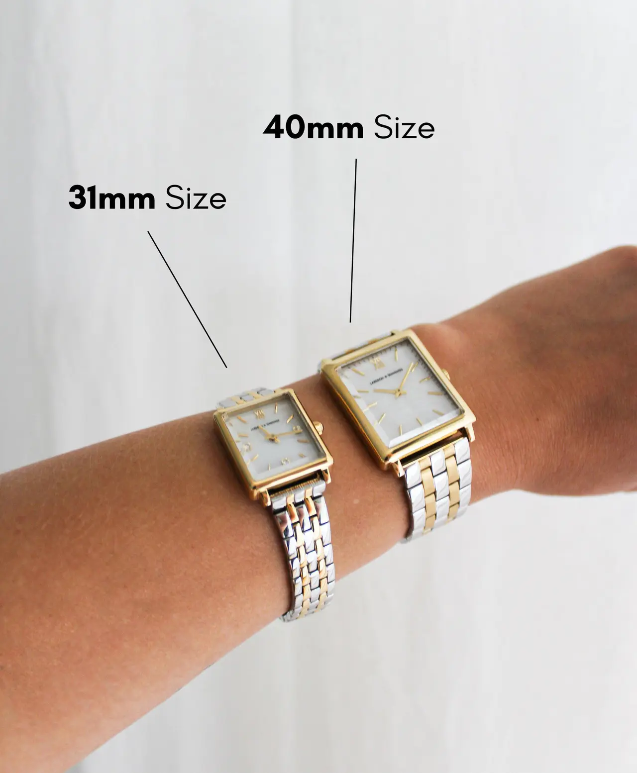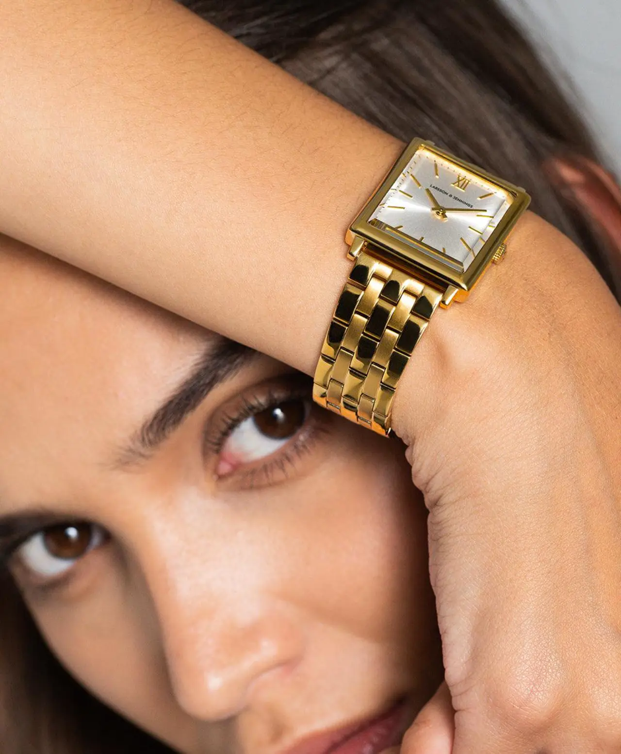 An iconic design, elevated. Combining the classic style of old vintage watches with an ultra-modern appeal in sleek and distinctive gold. The large square-shaped 40mm dial features roman numerals and a delicate sunray dial making it an eye-catching and versatile timepiece. Boyfriend pairs classic design with robust links made of gold-plated stainless steel for an effortless yet captivating piece.