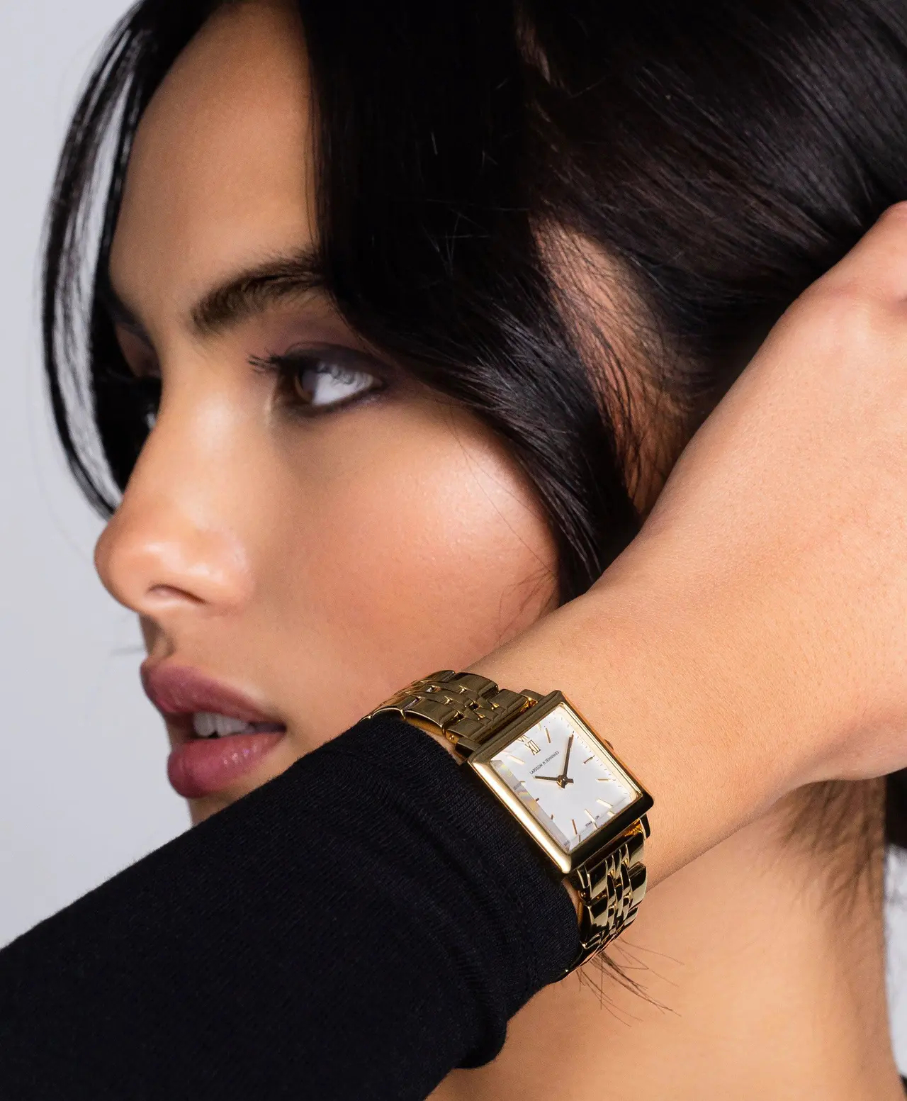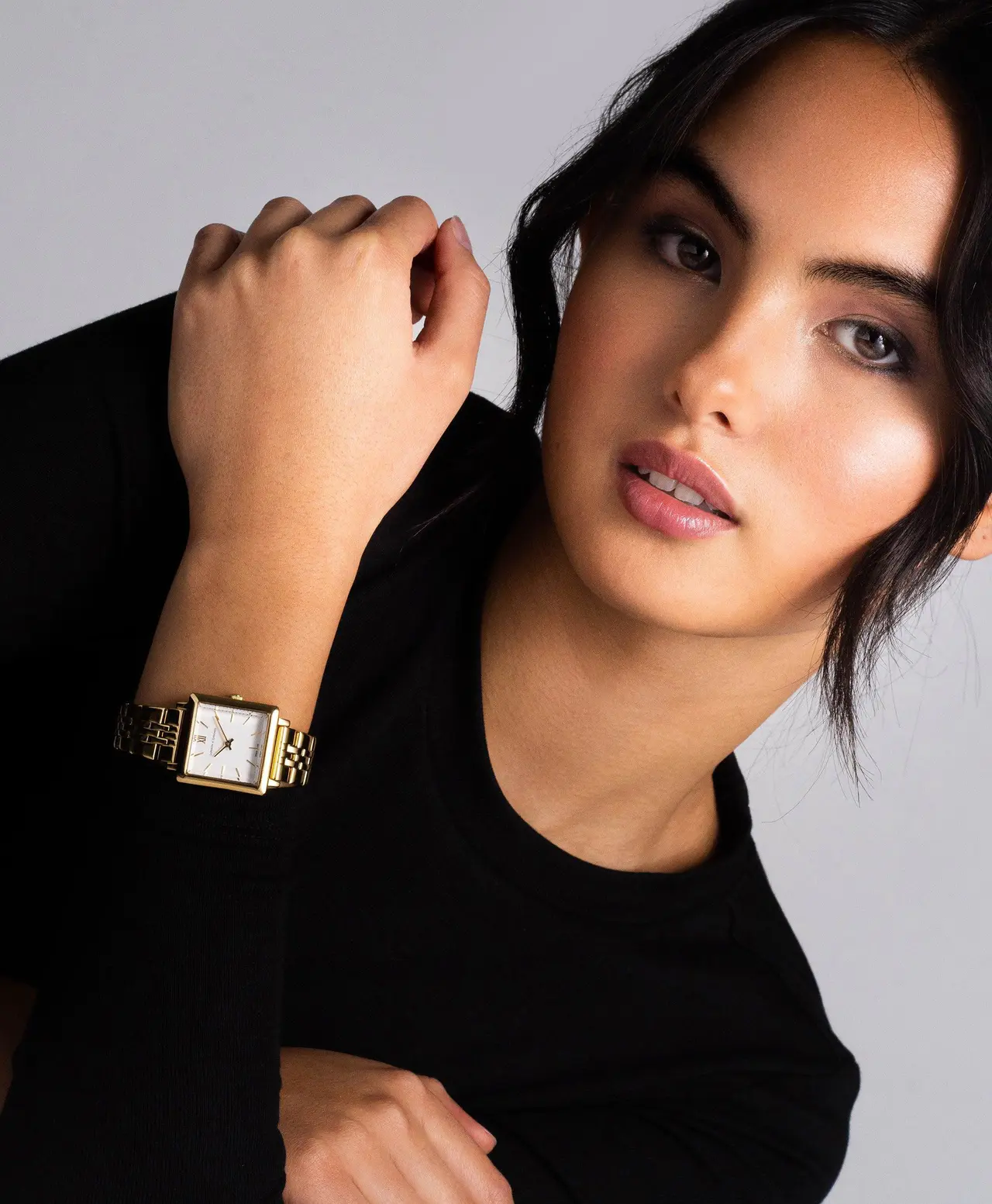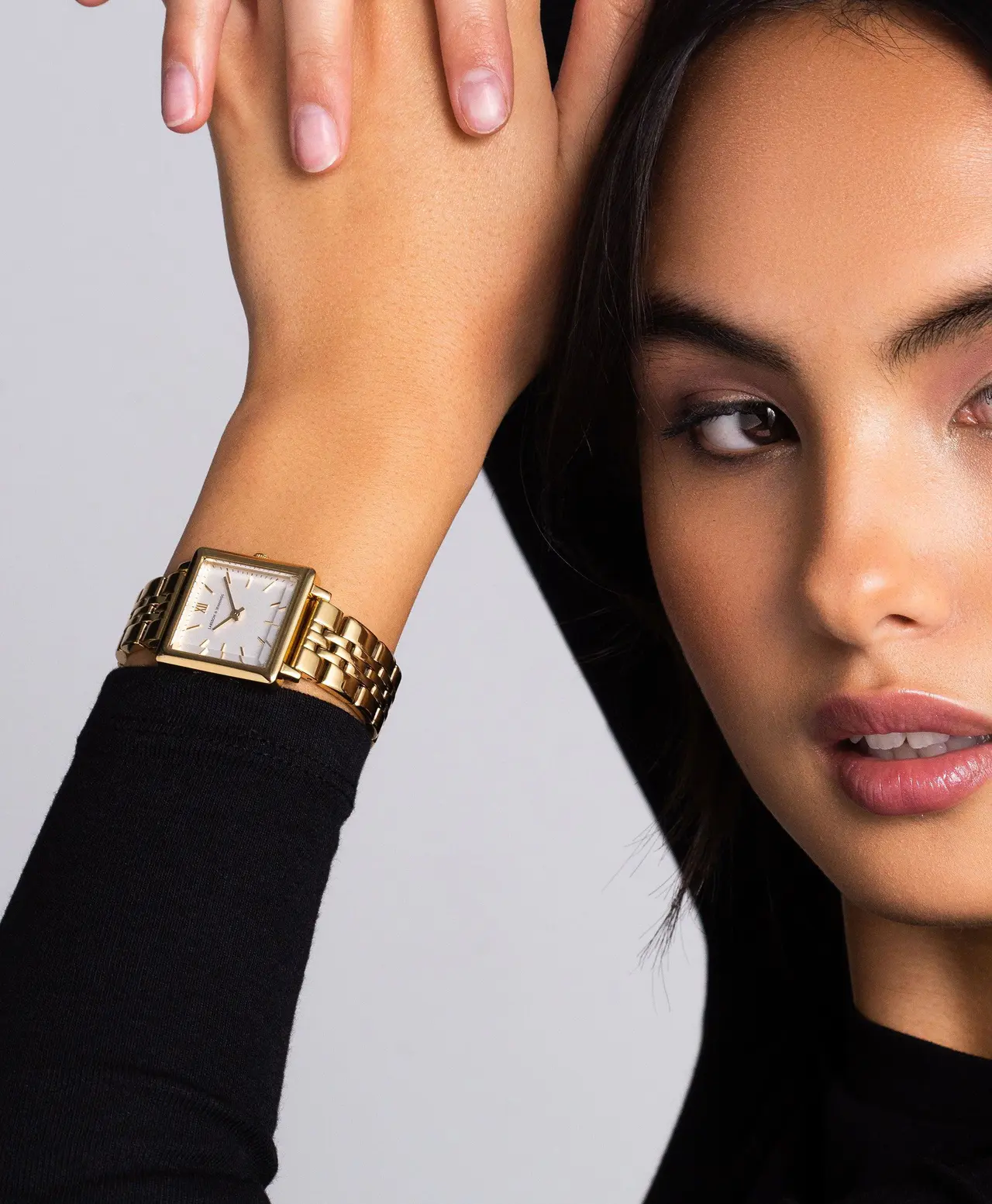 Our most recent update adds a sophisticated shiny link band to the delicate satin white dial on a versatile 34mm face, making this the most wearable addition to this distinctive collection and the perfect balance between functionality and aesthetics.