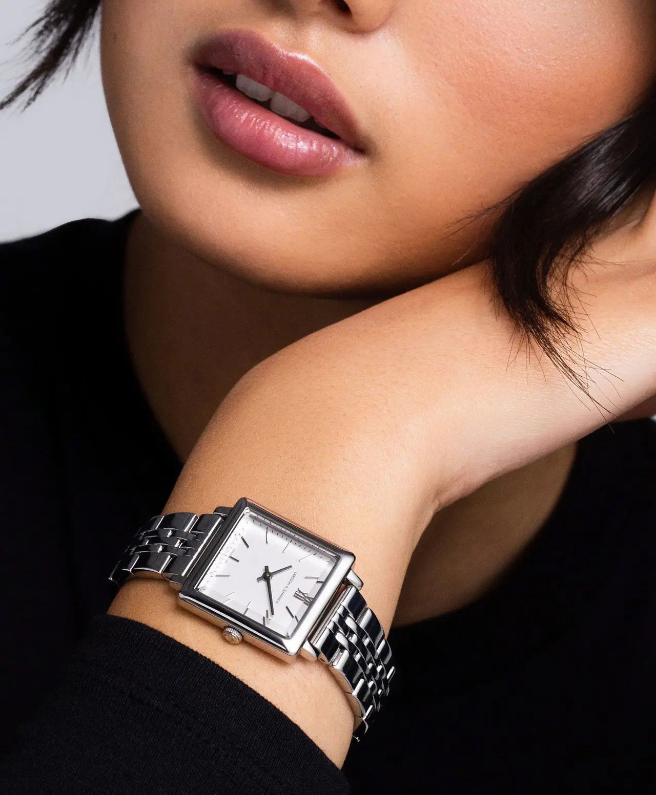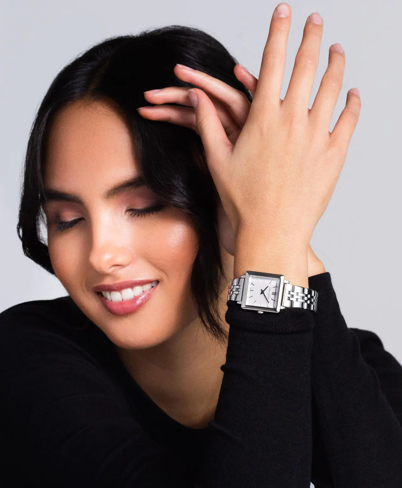 Our most recent update adds a sophisticated shiny link band to the satin white dial on a versatile 34mm face, making this the most wearable addition to this distinctive collection and the perfect balance between functionality and aesthetics.